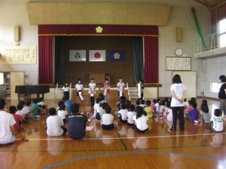 業間に5年生の発表集会がありました。まず、朝の会の様子を再現した発表でした、体力向上の運動や詩の朗読等でした。