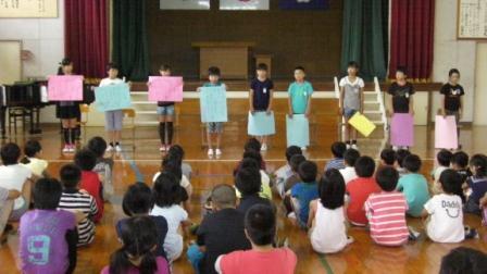 全校児童を代表して、4年生のユリナさん、しゅんぺいさんが、みんなの手本となる行動をすること、忘れ物をしないことなど、1学期の反省を生かして2学期の目標をしっかりと発表しました。