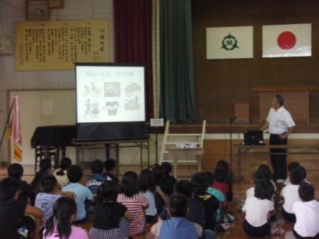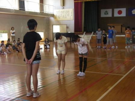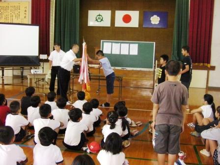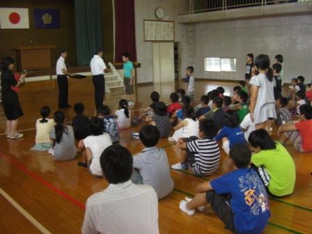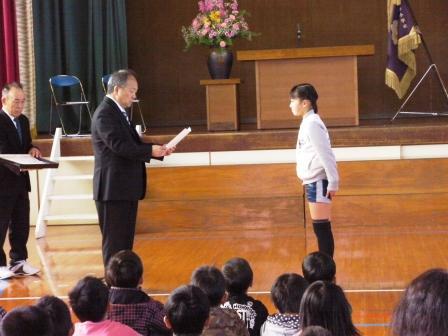 表彰もありました。夏休みに行われたドッジビー地区大会において、下学年Aチーム(準優勝)、上学年Aチーム(優勝)が素晴らしい成績を収めました。残念ながら、児湯郡大会は、台風のために中止となりました。