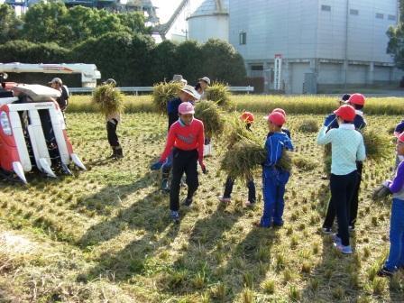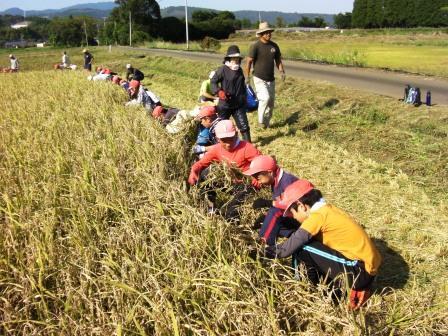 3年生以上の児童で、毎年恒例の稲刈りをしました。多数のJA青年部の方々に指導を受けながら、協力して楽しく稲刈りをすることができました。児童は、のこの刃のようなキザキザの刃がついた特殊な鎌で刈り取っていきました。結構力が必要で、児童は、のこぎりのような使い方をしている児童を多く見かけました。今年のもち米の収穫は、400kg弱とのことで、今度は、もちつきをして楽しみます。 写真はこちら