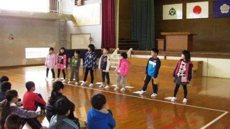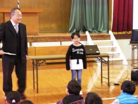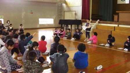 業間活動の時間に、3年生の発表集会がありました。まず、金子みすゞの詩「わたしと小鳥とすずと」「こだまでしょうか」の2編を暗唱し、元気よく発表しました。次に、リコーダーで「レッツゴー・ソーレ」と「冬さん さようなら」をきれいな音色で演奏しました。発表を聞いた感想もたくさん言ってくれました。