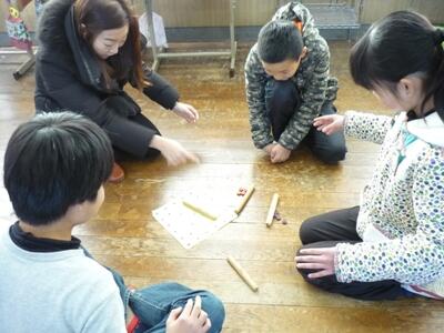 考えたゲームに挑戦しました。結果は、1位が6班、2位が5班、3位が3班でした。