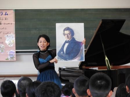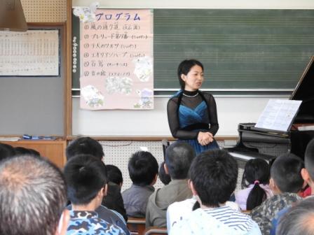 本日3校時、鑑賞教室を行いました。本年度の鑑賞教室は、メディキット県民文化センター(宮崎県立芸術劇場)のアウトリーチ事業(訪問コンサート)により、ピアノ演奏家の高場涼子さんによるコンサートを開催していただきました。総勢5名の方々においでいただきました。