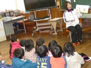 5年生や6年生の読み聞かせの様子です。熱心に聴いています。