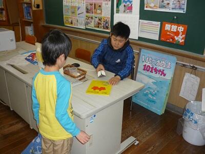 今日は、本校の委員会の一つであるブックスマイル委員会(図書委員会)の活動について紹介します。この委員会の主な活動は、学校図書館の図書貸出や返却のお世話、新刊の紹介などです。毎日の活動ですが、委員会の5名の子ども達は一生懸命に取り組んでいます。