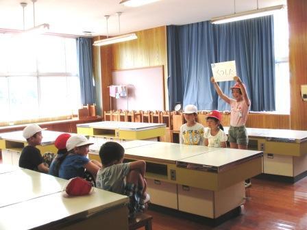 次に、全体のゲームを行いました。1年生の児童の名前をばらばらにし、並べ直して提示し、誰かを当てるゲームです。みんな、あっという間に正解を出していました。