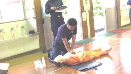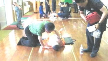 5月24日(水)に、東児湯消防組合から4名の救急救命士の方を講師にお迎えし、職員研修で心肺蘇生法講習会を実施しました。本研修会は、毎年、水泳指導シーズンを前に、教職員の心肺蘇生法の技術の向上を目指して行われるものです。