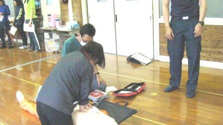 次に、2つのグループに分かれて、実際に一人一人ずつ実技を行いました。プリントを見ながら、順に胸骨圧迫30回と人工呼吸2回を繰り返すとともに、AEDの操作も交えての講習会でした。