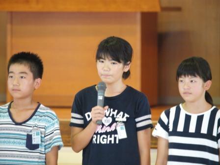 次に、3年生児童のかえでさんとりんさんが、全校児童を代表して、1学期にがんばったことやこれからがんばりたいことについて、大きな声で、はきはきと発表してくれました。図払い発表をありがとうございました。
