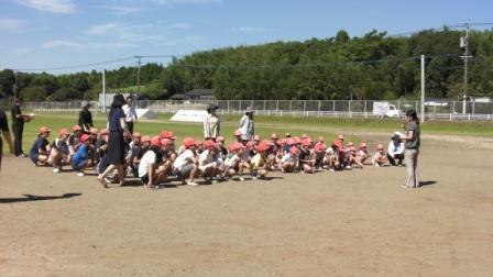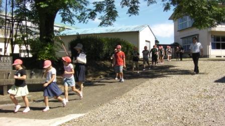 しばらくすると、校内放送で、「地震です。すぐ、机の下で、次の放送を待ちなさい。」と案内があり、「揺れが収まりました。運動場へ避難しなさい。」と、全校児童が、運動場へ避難しました。全員真剣で、誰一人しゃべる人もいません。避難放送から、5分弱で全員運動場へ避難できました。