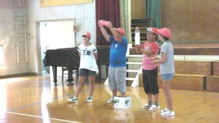 各団の紹介が終わると、いよいよ、みんなが心待ちにしていた、団の色決定です。決定方法については、毎年、趣向を凝らして、子どもたちを驚かせていますが、本年度は、団長が、校長先生とじゃんけんし、透明の水が入ったペットボトルを選び、そのペットボトルを、勢いよく振ると、赤と白に変化するという、仕掛けです。