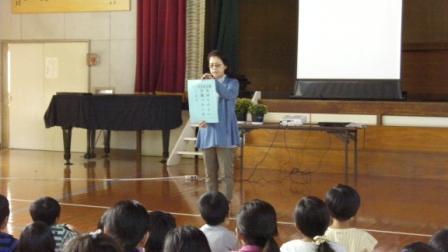 次に、心の教育担当の先生から、11月の生活目標「気持ちのよい 言葉つかいをしよう」について、「ちくちく言葉」・「ふわふわ言葉」の具体例をもとに、「友だちが、うれしくなるような言葉遣いや声かけをしましょう。」と、目標達成に向けての全員の実践を促されました。