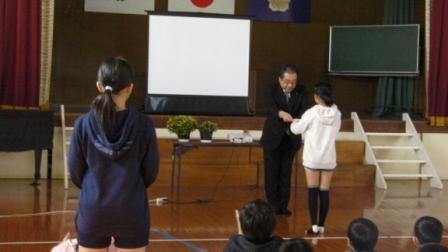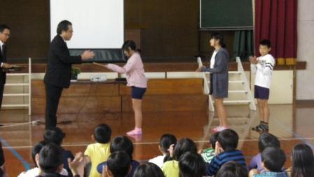始めに、1学期実施されましたスポーツテストの結果、A判定の認定証授与です。A判定認定者を代表して、6年生のかなでさんが、校長先生より認定証をいただきました。みなさん、おめでとうございます。来年もたくさんの人がA判定認定者になるよう、毎日、運動に挑戦しましょう。