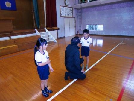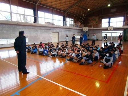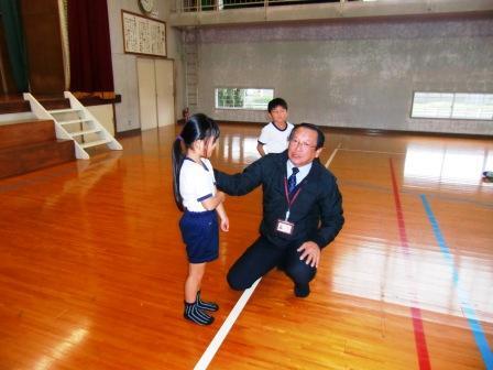 続いて、体育館に移動し、講師の先生より、学校内外で、不審者に出会ったり、声をかけられたりした時の児童の対応について、具体的場面を実際に想定し、代表児童と体験しながら、「いかのおすし」と対応させながら、ご指導いただきました。