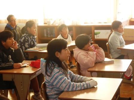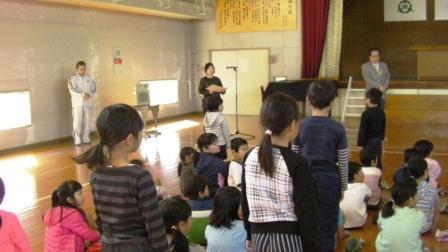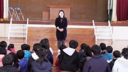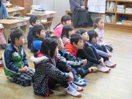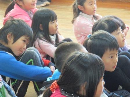 紙しばいを真剣に聞いてくれる1,2,3年生。それに対して、発表する4,5,6年生のすこやか委員会メンバー。とても生き生きと活動できました。