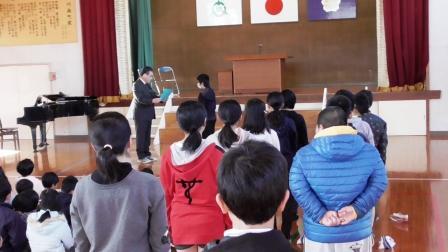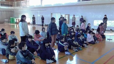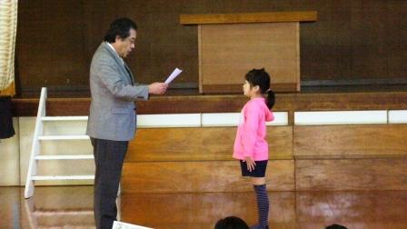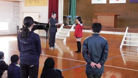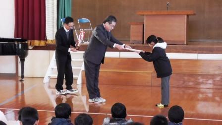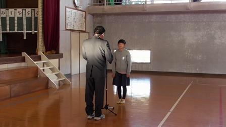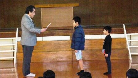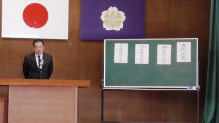 始めに、校長先生のお話がありました。2学期も、3つのキーワード「頭をきたえる」「体をきたえる」「心をきたえる」をがんばってきましたが、多くの学校行事や学習活動を例に挙げながら、1つ1つ振り返りをしていただきました。また、「ふ」~ふりかえりながら生活を。「ゆ」~勇気をもって元気なあいさつ。「や」~やめようあぶない遊び。「す」~すすんでしよう。おてつだい。「み」~みんなでそろって 元気に3学期をという言葉で、冬休みの過ごし方について、お話いただきました。