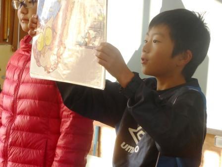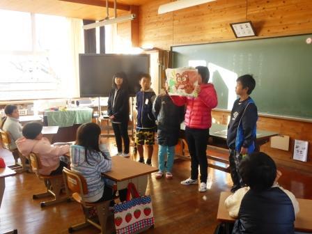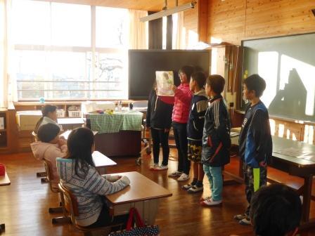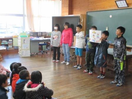 朝の会の時間に、すこやか委員会のメンバーが、1,2,3年生に、自作の健康紙しばいの読み聞かせをしました。