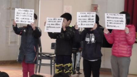最後に、健康つくり担当の先生から、今月の生活目標「かぜ・インフルエンザの予防につとめよう」について、すこやか委員会の児童とともに、「せきのエチケット」や「せきやくしゃみ」をした時の、ウイルスなどの跳び方等について、児童に分かりやすく工夫して、説明いただき、健康な毎日を過ごしていきましょう。と、くわしく説明いただきました。