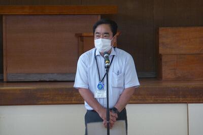 結団式では、はじめに校長先生がみどりの少年団活動の目的を話し、次に川南町産業推進課長さんが話をしてくださいました。