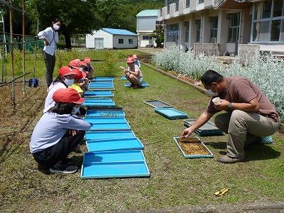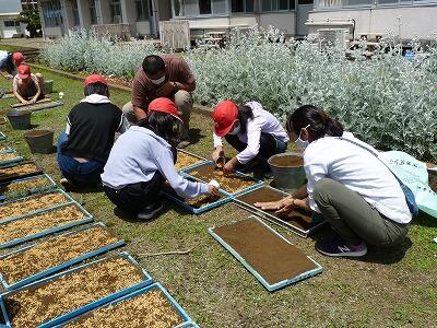 苗床に平らに土を入れることや、種もみを均等に蒔いていくことなどの話を聞いた後、1つの苗床に160gの種もみを蒔いていきました。今年度は、1人当たり2つの苗床の世話することになりました。
