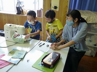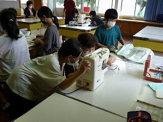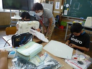 久しぶりなので、三つ折りの端を縫わず、真ん中を縫ったため、やり直しをする児童も見られましたが、支援ボランティアの方々の指導・支援をしていただき、みんなスムーズに作業を進めることができました。