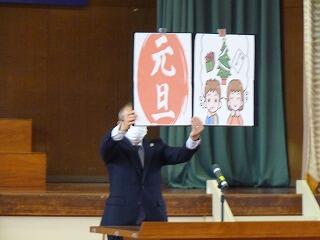 初めに、校長先生から、「1年を振り返ること、元旦には新しい年の目標をたてること、新型コロナウイルス感染症に気を付けて楽しい冬休みにすること」などの話がありました。
