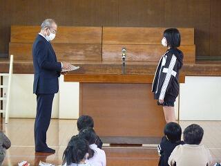 その後、「めざせ 図書館の達人コンクールの感想画の部門」で優良賞を受賞した4年生の河野 曖琉さんと「感想文の部門」で優良賞を受賞した5年生の河野 結音さん、「西都・児湯の子どもたちによる絵画展」で銀賞を受賞した4年生の牧平 楓太さんの表彰がありました。