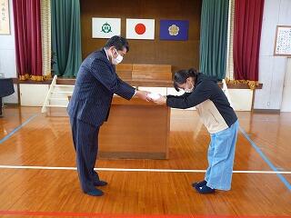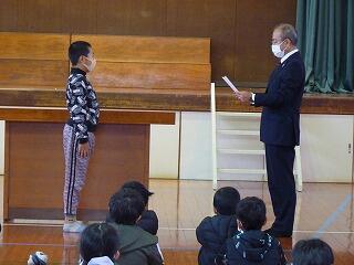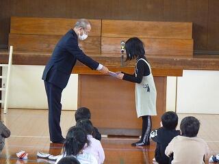 12月24日(金)の終業式の後、山本地区自治公民館(青少年育成協議会)から全児童に図書券とマスクをいただきました。