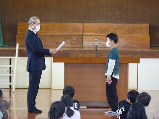 始業式の後、今月の目標についての話があった後、川南町社会福祉協議会の「シンボルマークのイラストと手書き文字コンクール」で入選した渡邊 壱心さんの表彰がありました。