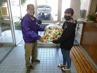 今日は、6年生の末廣 日菜さんが持ってきてくれたキャップ(45リットル袋2つ分)を川南ライオンズクラブの平田 順一会長にお渡しました。