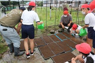 苗床に半分土を入れ、種もみをまき、その上に土を被せると説明を聞いた後、実際に苗床に種もみを蒔いていきました。