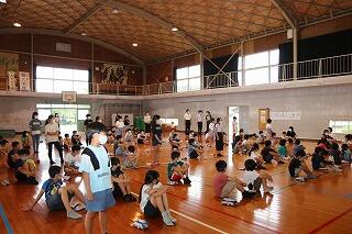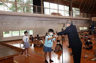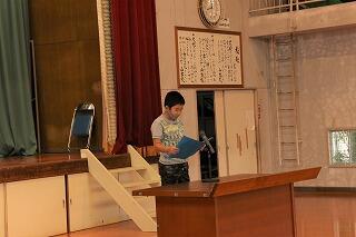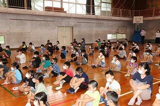 校長先生からは、「通知表から全校児童みんなの素晴らしい頑張りが見られたこと」や「山本地区を元気にしようとする6年生の活躍に感心したこと」また、「39日の夏休み『頭』『心』『体』の3つを鍛えましょう」と話がありました。