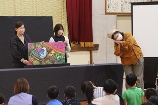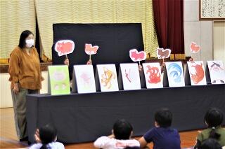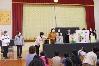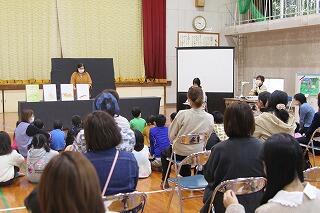 スクリーン絵本や手作りしかけ絵本、大型紙芝居、小さい絵本3冊を同時に使った読み聞かせなど