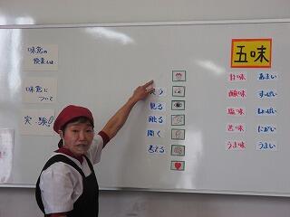 味には、「酸味」、「甘味」、「塩味」、「苦味」、「うま味」があることや、味覚は5感で感じたり、情報を生かしたりして味わうことなどについて学びました。