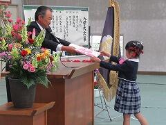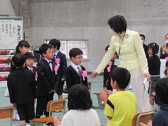 今年の新入生は、12名。たくさんの保護者や来賓の方々、5・6年生の先輩たちや先生たちが見守る中、緊張のようすで入場してきた新入生。それでも、担任の先生の氏名点呼にしっかりと返事をして起立をすることができました。続いて新入生を代表して、黒木海咲さんが真新しい教科書を受け取り、校長先生や教育委員会の方々のあいさつがありました。その間も、よい態度でしっかりと聞くことができました。その頑張る様子を見て、これからのみんなの成長が楽しみになりました。みんなで仲良く頑張っていきましょうね。