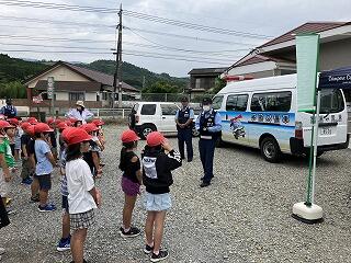 山本地区は、昨年までお世話になっていた十文字駐在所が川南交番に統合されたため、交番・駐在所の空白地域となっていました。移動交番車とは、県内のそのような地区を回るために新しくつくられた、動く交番のことです。まだ県内に1台しかないそうですが、その1台が山本小学校にやってきました。