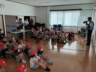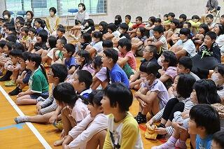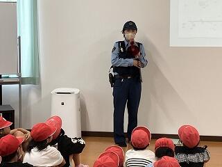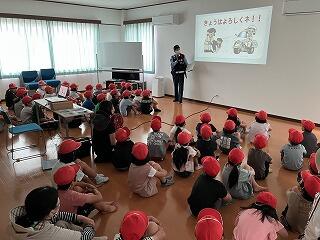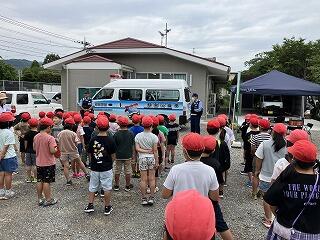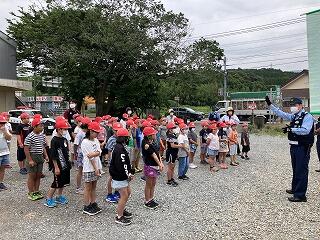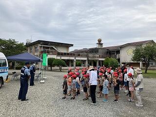 1年生から4年生のみんなが参加しました。まず、移動交番車の仕事について説明をしてくださった後、山本公民館に移動して、交通安全教室と警察の仕事に関するお話をしてくださいました。みんな一生懸命説明に聞き入っていました。最後に、警棒や手錠、警察手帳などを見せていただき、子どもたちは警察官という仕事に対して、興味を膨らませていました。将来、山本っ子の中から警察官が誕生するかもしれませんね。