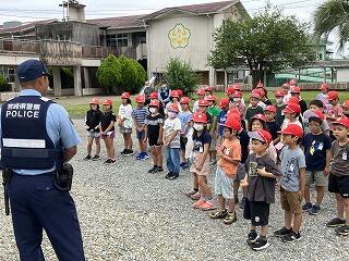 6月28日(水)学校に不審者が侵入したことを想定した避難訓練を実施しました。今回は、昼休み時間、校庭に不審者が侵入したという設定で、グラウンドで遊んでいる子どもたちが無事に避難できるかどうかを見ていましたが、6年生がみんなに声掛けをしながら、無事に逃げることができました。その後、不審者役をしてくださったスクールサポーターの桂様が、不審者に遭遇したときの注意点や対処の仕方について教えてくださいました。今回のようなことはないにこしたことはありませんが、いざというときは今日の学びを生かして、「自分の命は、自分で守る」を実践してほしいです。