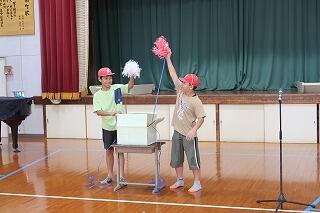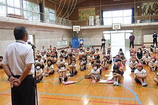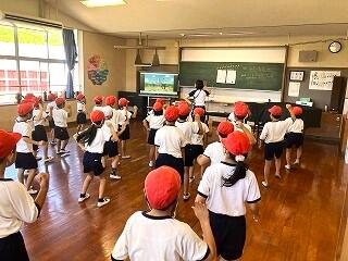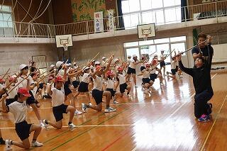 「奴踊り」とは、校区内の登り口地区に伝わる伝統芸能で、33年前から本校秋季運動会で披露しているそうです。今回は、奴踊り保存会で、本校の保護者でもあるお二人が来てくださり、直接ご指導してくださいました。上級生はこれまでの経験で慣れたものでしたが、下級生の子どもたちは勝手がわからず戸惑っていたようです。それでも、見よう見まねで最後には何とか踊れるようになりました。これから当日まで練習を重ね、本番では立派に踊りたいと思います。