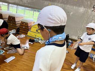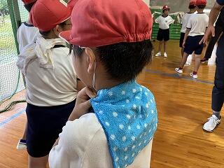 ここ最近、風は幾分涼しさを感じるようになりましたが、日中の日差しは真夏のように強く、まだまだ厳しい暑さです。学校では、体育の授業等を短く区切って、間に休憩時間を取りながら実施しています。各ご家庭にお願いしている「冷やしタオル」も効果抜群で、子どもたちは気持ちよさそうに使っています。
