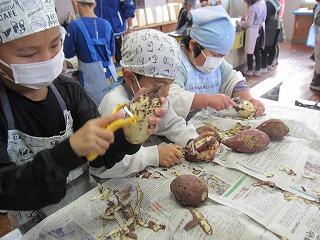 12月20日(水)1,2年生のみんなが、11月に収穫したお芋を使って、おいもパーティをしました。お芋は、自分たちで調理しました。皮をむいて、ゆでて、つぶして、バターや砂糖、牛乳を混ぜて、ラップで成形して、見事完成!お友達と協力して一生懸命作っていました。その分、味も格別!私たちにもおすそ分けがあったのですが、とってもおいしかったです。達成感と満足感で、最高の笑顔の1,2年生でした。