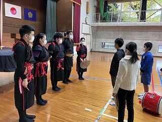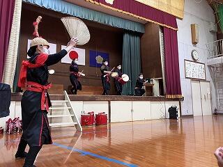 今年は、文化庁の「文化芸術による子供育成推進事業」として、文化芸術団体の沖縄歌舞劇団『美(ちゅら)』による実演芸術の巡回公演が行われます。今日は、本番に向けて、ワークショップ(事前の実演指導、鑑賞指導)をしていただきました。インフルエンザの罹患者が増加している状況でしたので、全校が集まっての一斉指導は自粛しました。本番で踊りに参加する6年生のみ体育館で指導していただき、他学年は各教室でリモートで参加しました。それでも、学校中に締太鼓やパーランクー、三線の音色が響き渡り、沖縄の雰囲気が漂っていました。