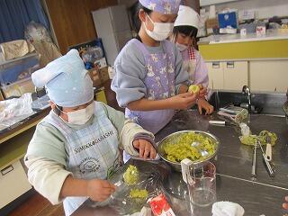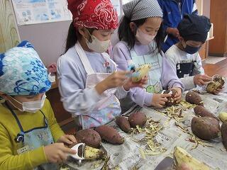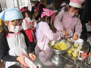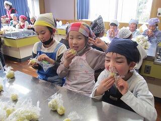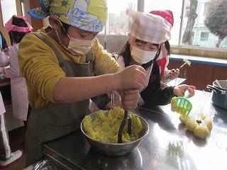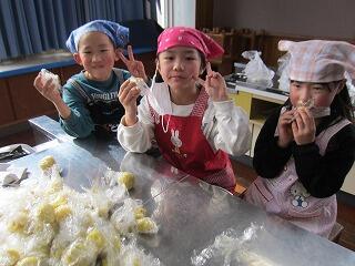 12月20日(水)1,2年生のみんなが、11月に収穫したお芋を使って、おいもパーティをしました。お芋は、自分たちで調理しました。皮をむいて、ゆでて、つぶして、バターや砂糖、牛乳を混ぜて、ラップで成形して、見事完成!お友達と協力して一生懸命作っていました。その分、味も格別!私たちにもおすそ分けがあったのですが、とってもおいしかったです。達成感と満足感で、最高の笑顔の1,2年生でした。