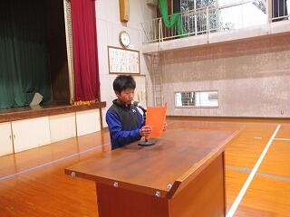 1月9日(火)3学期の始業式を行いました。最初に、5年生の代表児童2名が新年の抱負を発表しました。「国語の漢字で100点を取る。地域の方々へ気持ちの良い挨拶をする。高学年としてボランティア活動をすすんでする。」「英単語を覚え発音に気を付け頑張る。凡事徹底。身の回りの整理整頓をする。友達にやさしい自分になる。」と、それぞれ立派な態度で発表することができました。他のみんなも、しっかりと目標をもち、成長の一年となるよう、また全校一丸となって頑張っていきましょう。