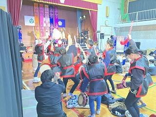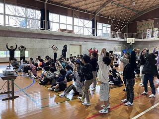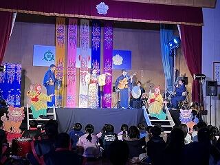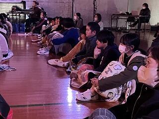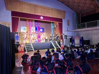 1月23日(火)12月に行われたワークショップから約1か月半、待ちに待った鑑賞教室が開かれました。この日のために、遠く沖縄から沖縄歌舞劇団『美(ちゅら)』にみなさん、総勢17名が山本小学校に来てくださいました。会場のセッティングやリハーサルのために昨日から宮崎入りされていて、本当にありがたいことです。