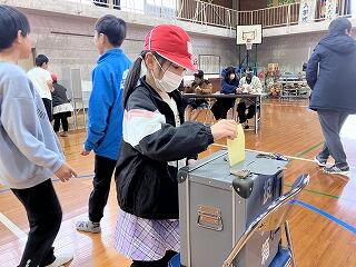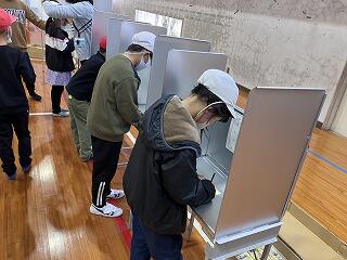 その後昼休みには、全校児童を対象に、「川南町給食選挙」と題して、好きな給食メニューに投票する体験をさせてくださいました。実際の選挙で使用される記載台や投票箱を使って貴重な体験をすることができました。