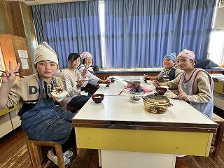 1月25日(木)3,4時間目に、5年生が家庭科の調理実習を行いました。今回のメニューは、「ごはん」と「みそ汁」の和食でした。ごはんとみそ汁?と侮ることなかれ。ごはんは炊飯器ではなく鍋で炊き、みそ汁もちゃんと煮干しで出汁をとり、大根、油揚げ、長ねぎの具を入れた超本格派です。班の仲間と協力しながら、一生懸命作っていました。完成後、みんなで会食。ちゃっかり私もお呼ばれしました。ごはんもみそ汁もとてもおいしかったです。ぜひ、家でも作ってもらってみてください。(笑)