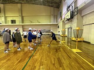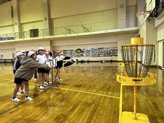 まずは、「ディスクゴール」。みんな、ねらいを定めて、シュート!