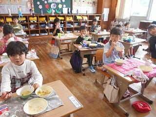 給食の準備や片付けは、6年生2人に手伝ってもらっています。