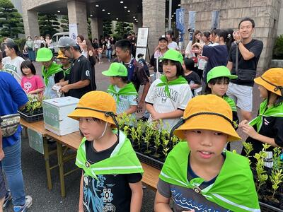 山本小(4年生以上の児童)はこの夜市の中で、緑の募金活動を実施しました。募金をしてくださった方に、苗木を渡しました。たくさんの募金、ありがとうございました。